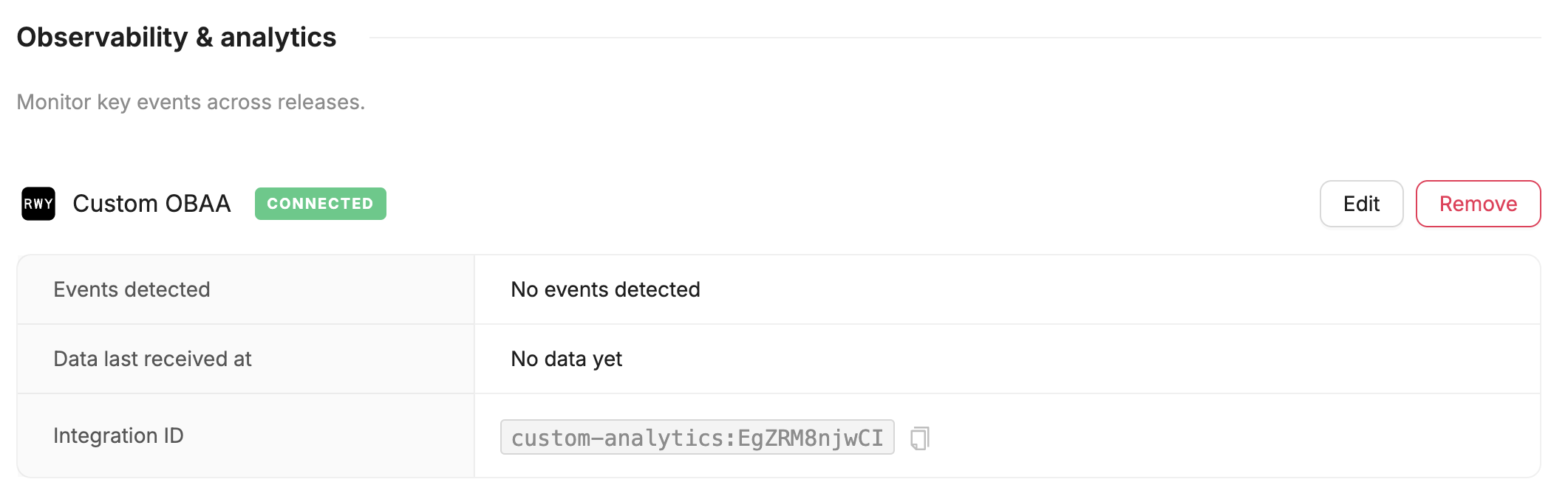 If your team has an in-house analytics framework, or would otherwise like to compute metrics on your own servers and push them as needed to Runway, you can connect a custom Observability & analytics integration to accomplish this. Once connected, a unique integration identifier will be generated that you can use to construct an endpoint URL for Runway's public API that can be used to stream data points to your app's integration in Runway.