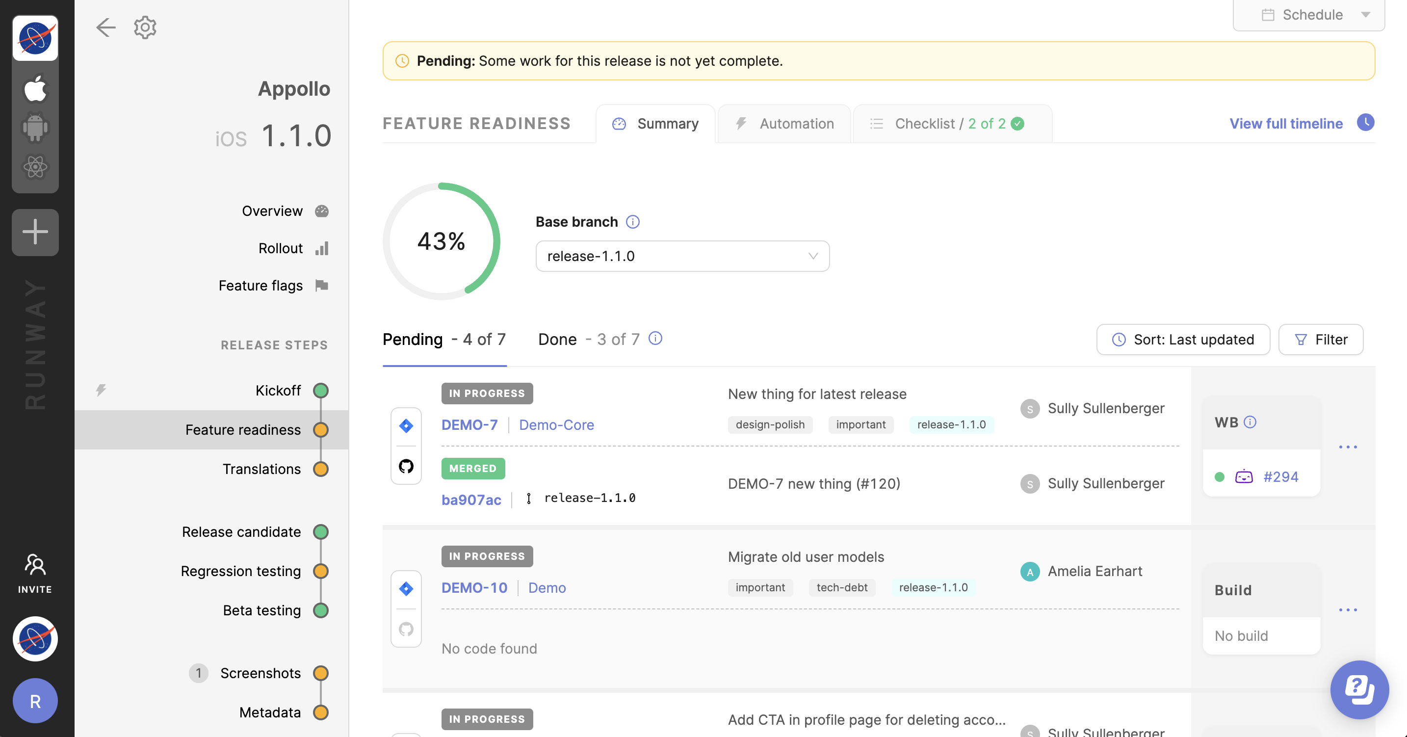 The Feature readiness step shows you the status of all work that is slated for the release. Instead of seeing only a siloed view of only project tickets or only committed code, Runway intelligently reconciles both to provide a single source of truth and a better understanding of your team's progress towards being feature complete.
