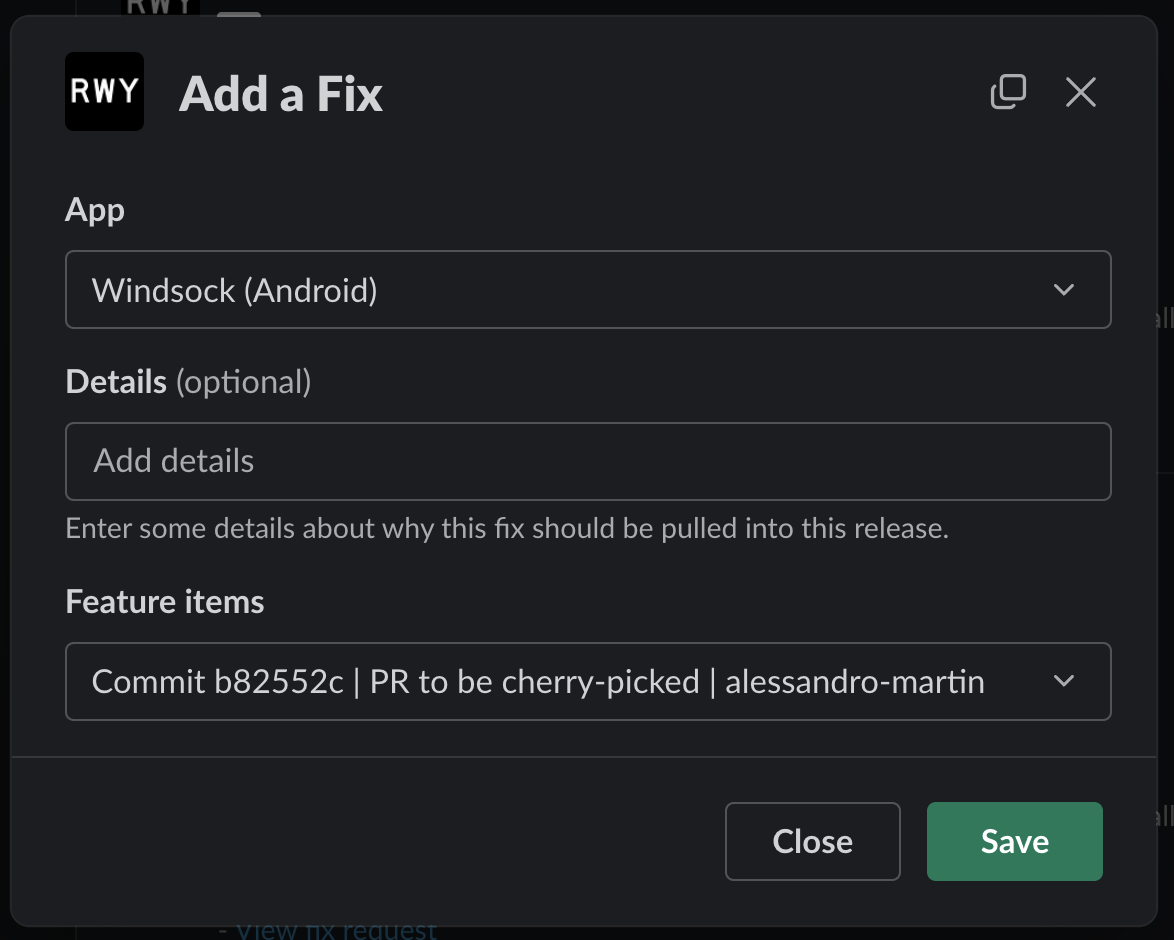 You can also add a fix to the release via Slack. The following Slack slash command will pull up a form to add a fix to the current release without ever leaving Slack: