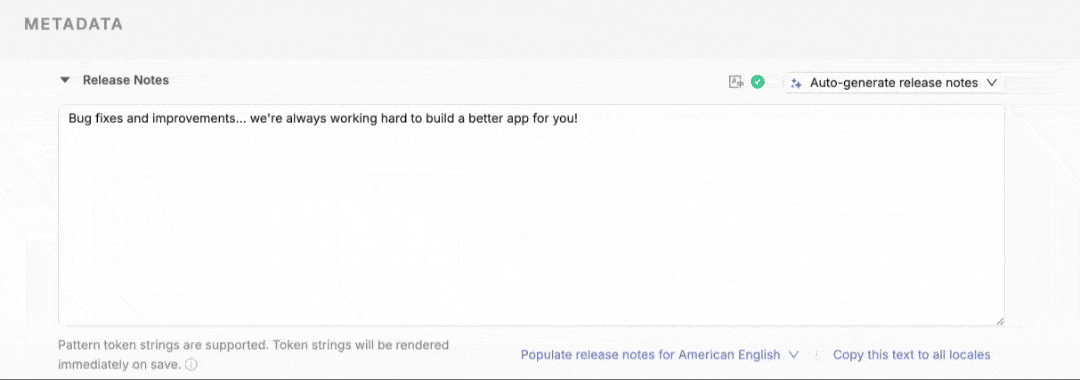 All of the above options are available in Runway wherever you can enter different kinds of release notes: store metadata, release description, release summary, and beta testing notes.  Read more about [allowed tokenized patterns for release notes here.](https://docs.runway.team/getting-started/pattern-strings-tokens)