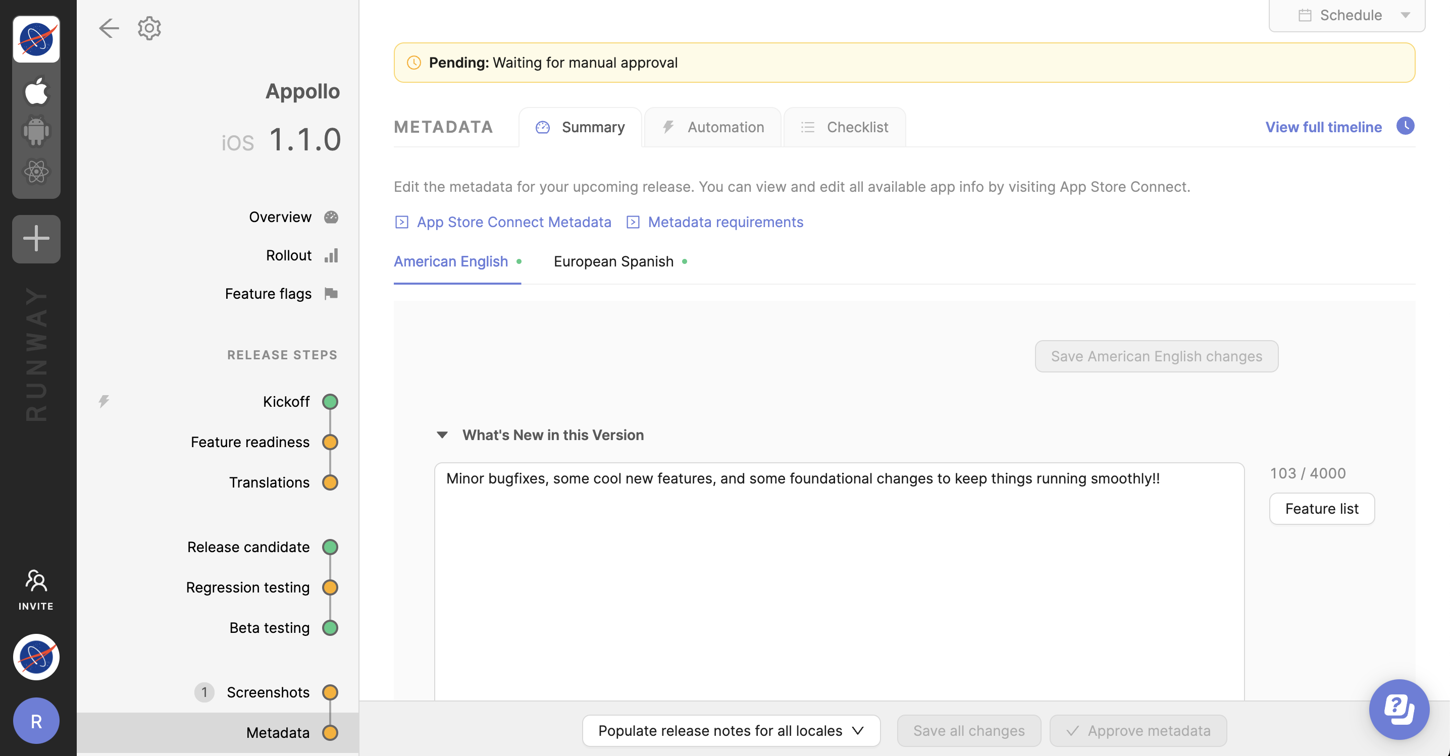 Release pilots or other users with sufficient privileges can click the **Approve metadata** button at the bottom of the view to mark this step as ready. This will set the Metadata step as <mark style="color:green;">green</mark>/ready (and may unblock automations like [Submit app for review on target date](https://docs.runway.team/automations/types-of-automations#submit-app-for-review-on-target-date) that depend on all previous steps being green).